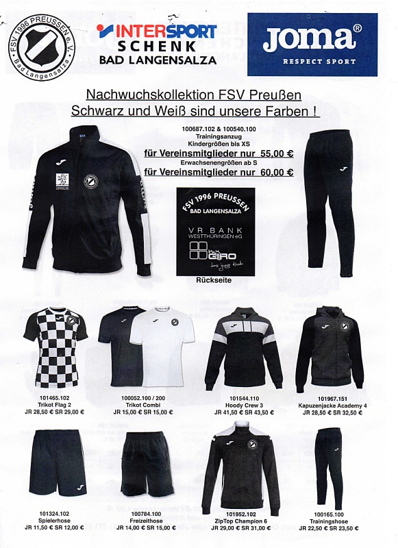 Wer noch auf der Suche nach einem passenden Weihnachtsgeschenk ist, wird vielleicht in der aktuellen Nachwuchskollektion des FSV Preußen fündig. Zur Komplettierung der Trainingsausrüstung werden unter anderem Shirts, Hosen, Rücksäcke, Regenjacken, Sporttaschen angeboten.