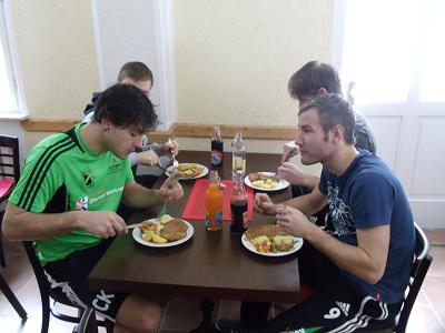 Nach dem ersten Tag im Trainingslager entschwanden ein Großteil der Spieler in die Träume. Einzig in einem Zimmer war noch ein wenig Remmidemmi mit entsprechend Live-Musik und dargebotenen Leibesübungen. Dennoch waren am heutigen Morgen alle pünktlichst halb 8 beim Frühstück, bei dem es an nichts fehlte, außer ein paar Eiern. Zur Belustigung aller wurden von verschiedenen, dafür prädestinierten Spielern ein paar Sprüche zum Besten gegeben. Anschließend war Zeit zum Chillen oder Playstation spielen, da man den Waldlauf, der laut Plan vorgesehen war, aufgrund von Rutschgefahr ausfallen ließ. Danach brach man gemeinsam um 10 Uhr zum ersten Training des Tages nach Geraberg auf. Über Nacht hatte es begonnen zu tauen, so dass sich auf dem Kunstrasenplatz ein Gemisch aus Schneematsch und Wasser präsentierte. Das sorgte natürlich nicht für die besten Verhältnisse. Nach einer Erwärmung mit Einlaufen und den bekannten Hüpf-Spring-Übungen wurden 2 Teams gebildet, die an mehreren Stationen gegeneinander antraten. Zuerst war Handball mit der Medizinkugel angesagt, wo das Team mit 10 Ballberührungen nacheinander einen Punkt bekam. Endstand dabei war 5:1 für Günther, Maik und Co. gegen Carsten, Benni und Konsorten. Die Spielformen wurden intensiviert und mit einer Einheit das Verschieben geübt. Dann gab es einen Wettlauf gegeneinander, bei dem Medizinballstaffeln und Hucke-Pack-Läufe den Sieger ermittelt haben. Oli drehte erneut seine Runden und Co-Trainer Uwe Schmidt absolvierte eine Trainingseinheit mit Lucas im Tor, nach welcher beide klatschnass ihre Schuhe und Handschuhe ausrangen. Die Mannschaft spielte zum Abschluss noch ein halbes Stündchen auf dem Halbfeld auf 2 Tore gegeneinander, wobei nicht wirklich ein Spielfluss zustande kam, da die Kugel nach jedem Pass sofort in einer Schneepfütze hängen blieb. Dennoch war es ein engagiertes Training von unseren Jungs. So waren alle froh auf eine warme Dusche vor dem Mittagessen, bei welchem Schnitzel mit Kartoffeln und Gemüse aufgetischt wurde. Gleich danach ging es gemeinsam in den örtlichen Konsum, wo die Getränkevorräte aufgefüllt wurden und noch ein Kuchen für den Nachmittag organisiert wurde. An jenem war erneut Zeit zum Chillen, zum ausgedehnten Fifa-Turnier auf der Playstation, zum Schlafen oder zum Karten spielen, denn die eigentlich angesetzte Trainingseinheit wurde abgesagt. Bei diesen Verhältnissen hätte es sicherlich keinen Sinn gemacht, weswegen die Entscheidung vernünftig war. Als Capitano Max und Betreuer Micha mit einem Tag Verspätung eingetroffen waren, hing der Chefcoach seine Tapete an die Wand und erklärte der Truppe die Aufstellungen für beide Halbzeiten des abendlichen Testspiels . Außerdem stimmte er die Mannschaft emotional und fordernd auf die Rückrunde ein. Zwischenzeitlich waren unsere Nachwuchsspieler der A- und B-Jugend eingetroffen, die freudig begrüßt wurden. Viertel 6 war Abfahrt zum Platz, der inzwischen etwas mehr grüne Flecken hervorbrachte und sich zudem 3 Leutchen mit einem Schneeschieber der Räumung der Strafräume widmeten. Halb 7 war Kick Off zum Testspiel gegen die Spielvereinigung Geratal, die in Grün auf unsere Preußen in Blau, leider nicht schwarz-weiß, traf. Die erste Viertelstunde war eine Katastrophe, denn nach dieser hatte Lucas die Kugel schon drei mal aus dem Netz fischen müssen. Ein Tor nach ner Ecke und 2 Fernschusstore in den oberen Winkel sorgten für diesen deutlichen Spielstand. Unser Fußballsportverein kam schlecht mit dem rutischigen Platz und dem aggresivem Gegner zurecht. Immerhin erhöhte sich das Ergebnis bis zur Pause nicht mehr. Im zweiten Durchgang waren neben unseren zwei extra angereisten Vorstandschefs A. John und B. Harbauer die Nachwuchsspieler unseres Vereins Zeuge der Partie und sahen eine etwas ausgewechselte und auf den Positionen veränderte Preußen-Mannschaft, die im weiteren Verlauf durch Carsten Krumbein etwas Ergebniskosmetik betreiben konnte. Dennoch ging das Spiel verloren, welches teilweise etwas überhart geführt war. In Spielerklamotten führte der Weg zurück in die Herberge, wo geduscht wurde und sich alle hungrig auf das Abendbrot freuten. Mit Hackbraten und Kartoffelsalat war dieses nicht sehr ergiebig, weshalb nochmal für über 50 Euro beim örtlichen Pizza--und Dönerlieferanten nachgeschlagen wurde. Zum Ausklang des Abends versammelten sich alle vor dem Fernseher, auf welchem die Zusammenfassung der zweiten Liga für Unterhaltung sorgte. Inwiefern das ganze dann weiterhin noch ausgegangen ist, das wird dann vermutlich am morgigen Tag veröffentlicht...