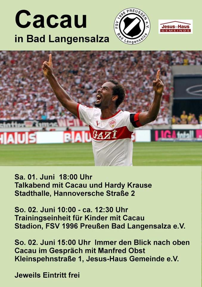 Einen seltenen Besuch erlebt Bad Langensalza am kommenden Wochenende. Zwar kommt mit Marco Engelhardt ein ehemaliger Bundesliga-Profi und deutscher Nationalspieler aus LSZ, er wird es jedoch nicht sein, welcher der Rosenstadt einen Besuch abstattet. Dafür erwarten wir einen anderen Fußballer, der früher beim 1. FC Nürnberg aktiv war: Cacau wird sich die Ehre geben, welcher seine längste und erfolgreichste Zeit beim VfB Stuttgart hatte, wo er auch zum deutschen Nationalspieler berufen und mit der Jogi-Truppe 2010 Dritter bei der WM in Südafrika wurde. Ergeben hat sich der Besuch von Cacau über die Jesus-Haus-Gemeinde in Bad Langensalza, in welcher er am Sonntag-Nachmittag unweit des Stadions zu Gast sein wird. Bereits am Samstag-Abend um 18:00 Uhr gibt es eine Talkshow mit ihm und Moderator Hardy Krause in der Stadthalle (neben der Salza-Halle). Am Sonntag-Vormittag wird Cacau dann im Stadion der Freundschaft eintreffen und ab 10:00 Uhr auf dem Rasen eine Trainingseinheit für unsere Nachwuchs-Kicker und alle interessierten Kinder durchführen, inklusive Autogrammstunde und Bratwurst-Braten. Bei allen Veranstaltungen sind Gäste Herzlich Willkommen, der Eintritt ist jeweils frei!