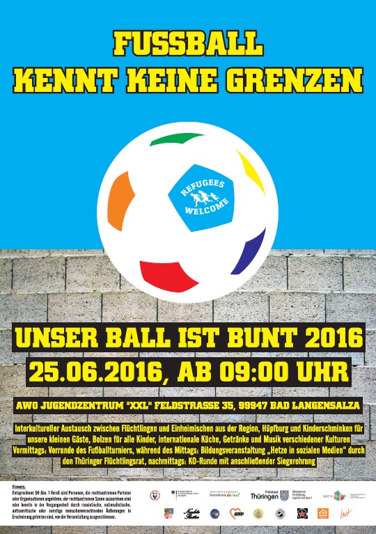 Bereits die vierte Auflage erlebt am Wochenende das vor 3 Jahren von den Fans der „Nackten Reiter“ ins Leben gerufene Fußballturnier „Unser Ball ist bunt“. Unter dem Motto „Fußball kennt keine Grenzen“ treten am Samstag, den 25.06.2016 wieder viele junge und ältere Fußballer aus verschiedenen Kulturen im Jugendzentrum „XXL“ gegeneinander an. Wie im vergangenen Jahr dreht sich die Thematik um die Flüchtlingssituation. Da seit Herbst einige Asylsuchende aus Syrien in Bad Langensalza Zuflucht gefunden haben, wurden diese von den Organisatoren zum gemeinsamen Spiel eingeladen, so dass alle Anwesenden einen geselligen Tag erleben können und sich mit der syrischen Kultur vertraut machen können. Die Geflüchteten werden wieder landestypische Speisen anbieten und Musik aus ihrem Land mitbringen. Nachdem am Vormittag ab 09:00 Uhr die Vorrunde absolviert wird, wird in der Mittagspause ein Vertreter des Thüringer Flüchtlingsrates einen Einblick zum Thema „Hetze in sozialen Netzwerken“ geben, so dass alle Gäste dagegen sensibilisiert werden sollen. Mit den Entscheidungsspielen und der Siegerehrung wird der Tag zu Ende gehen. Eingeladen sind vor allem Familien mit ihren Kindern, es wird eine Hüpfburg geben sowie die Möglichkeit sich schminken lassen. Natürlich kann während der Mittagspause auch ausgiebig Fußball gespielt werden.