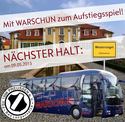 Am kommenden Samstag, zum ersten Matchballspiel, besteht für die Anhänger unserer Mannschaft die Möglichkeit mit den Jungs gemeinsam nach Westerengel zu reisen. Im Reisebus der LEWA, einem Unternehmen unseres Sponsors Lothar Warschun, kann man für nur 5 € Eigenanteil eventuell miterleben, wie unser Verein nach 23 Jahren wieder ins Thüringer Oberhaus aufsteigt. Dafür ist ein Punkt die Vorgabe und das auf dem Platz, wo unser Verein noch nie gewinnen konnte.