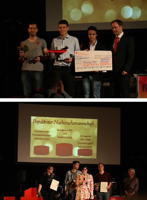 Des Weiteren wurden am Samstagabend in der Mühlhäuser Kulturstätte am Schwanenteich unsere B-Junioren als drittpopulärste Nachwuchsmannschaft des Kreises ausgezeichnet. In der Saison 2013/14 wurden sie souverän Meister der 1. Kreisklasse, büßten dabei in 14 Spielen keinen Punkt ein und holten mit 118:2 ein sagenhaftes Torverhältnis. Erst im letzten Saisonspiel mussten die Jungs von Trainer Steffen Echtermeyer die einzigen beiden Gegentore des Spieljahres hinnehmen. In dieser Saison kämpft die Mannschaft um den Klassenerhalt in der Verbandsliga. Auch den B-Junioren gratuliert der Vorstand herzlich zur Auszeichnung, für welche es allerdings lediglich eine Urkunde gab, welche Hans-Richard-Büchner stellvertretend für das ganze Team auf der Bühne entgegen nahm.