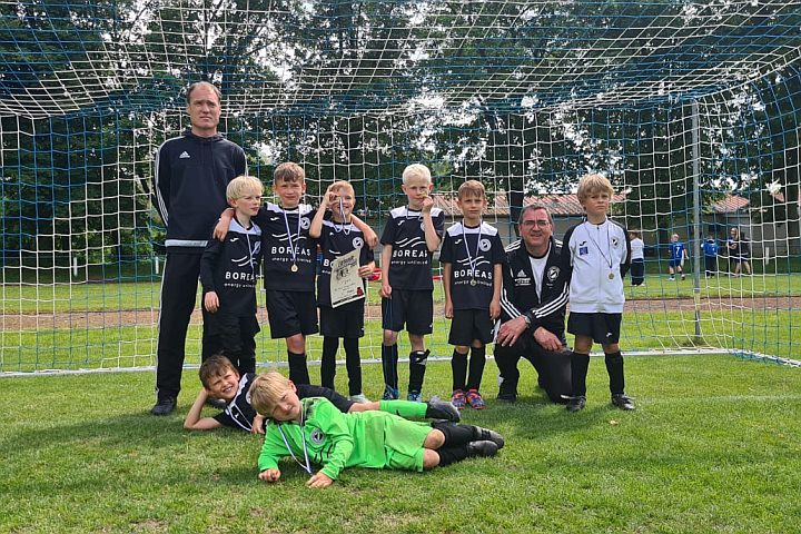 Heute Vormittag nahmen unsere F2-Junioren am Pfingsturnier des FC Gebesee teil. Wegen des teilweise heftigen Regens startete das Turnier mit etwas Verspätung. Bei ihrem ersten Auftritt wirkte unsere Mannschaft überhaupt nicht wach und zog gegen den FC Erfurt Nord verdient mit 0:3 den Kürzeren. Besser lief es dann gegen den FC Gebesee II. Allerdings wollte der Ball einfach nicht den Weg ins gegnerische Tor finden. Ganz im "Leverkusen-Style" klappte es dann aber doch. Paul versenkte das Leder zum 1:0, Anstoß und Abpfiff. Nächster Gegner war der spätere Zwetplatzierte TSG Stotternheim. Zwei Mal gelang es durch sehenswert herausgespielte Tore von Paul und Jakob einen Rückstand auszugleichen. Zwei unnötige Ballverluste kosteten den möglichen Punktgewinn und unsere Jungs verloren mit 2:4. Nichts zu holen gab es gegen den Turniersieger Empor Walschleben. Schnell lagen die Schwarz-Weißen mit 0:3 zurück, aber Elias gelang wenigstens noch der Ehrentreffer zum 1:3. Ungewohnt für unsere Jungs war die nächste Begegnung gegen die Mädchenmannschaft vom FFV Erfurt. Obwohl die Erfurter Mädels im Schnitt einen Kopf größer waren, setzten sich die Mini-Preußen nach dem entscheidenden Tor von Emilio knapp mit 1:0 durch. Beim 3:0 über den SV Witterda vergaben die Schwarz-Weißen viele Chancen leichtfertig. Trotzdem gelang durch den Dreierpack von Elias ein ungefährderter 3:0-Erfolg. Im letzten Spiel gegen den FC Gebesee I ging unseren Jungs etwas die Puste aus. Nach 0:2-Rückstand gelang Elias der Anschlusstreffer, aber Gebesee antwortete umgehend mit dem 1:3.