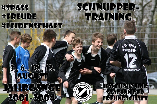 Du hast Spaß am Fußball und willst gern öfter spielen? Du hast es drauf am Ball und willst es allen zeigen? Du hast erst angefangen und willst dich verbessern? Dann suchen wir genau DICH! Denn ab dem 3. August finden auf dem neuen Kunstrasenplatz im Stadion der Freundschaft drei Schnupperkurse (3./ 6./10./13.8.) für die Jahrgänge 2001-2004 statt. Unter Anleitung der Trainer Jörg Weißenborn und Sven Harnisch kannst du dich am Ball und im Team versuchen.