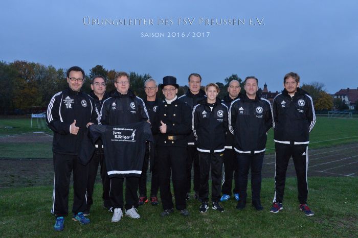 Bereits vorletzte Woche versammelten sich die Verantwortlichen unserer 10 Nachwuchs-Mannschaften, um dem Sponsor Jens Rödiger für seine Unterstützung zu danken. Der Schornsteinfeger-Meister übergab an die Übungsleiter unseres Vereins neue wetterfeste Trainingsjacken von Adidas, so dass alle ehrenamtlich engagierten Trainer für die in nächster Zeit zu befürchtenden Wetterbedingungen gut gerüstet sein werden. Wir möchten auf diesem Weg als Verein den herzlichen Dank an Jens aussprechen, was vor allem im Sinne aller Jugend-Spieler und deren Eltern passiert. Er ist seit Jahren unserem Verein wohl gesonnen und fiebert zudem familiär bedingt mit, da sein Sohn Paul als Mitglied der C-Junioren-Mannschaft aktiv ist. Zu sehen ist der Spender auf dem Gruppenfoto in seiner Dienstkleidung, mit welcher er sich perfekt an die seit 115 Jahren existierenden Vereinsfarben des FSVP anpasste. Möge seine Freude an unserem Verein weiterhin mit viel Überzeugung bestehen und seine immer gute Laune für stets positive Stimmung im Stadion der Freundschaft sorgen.