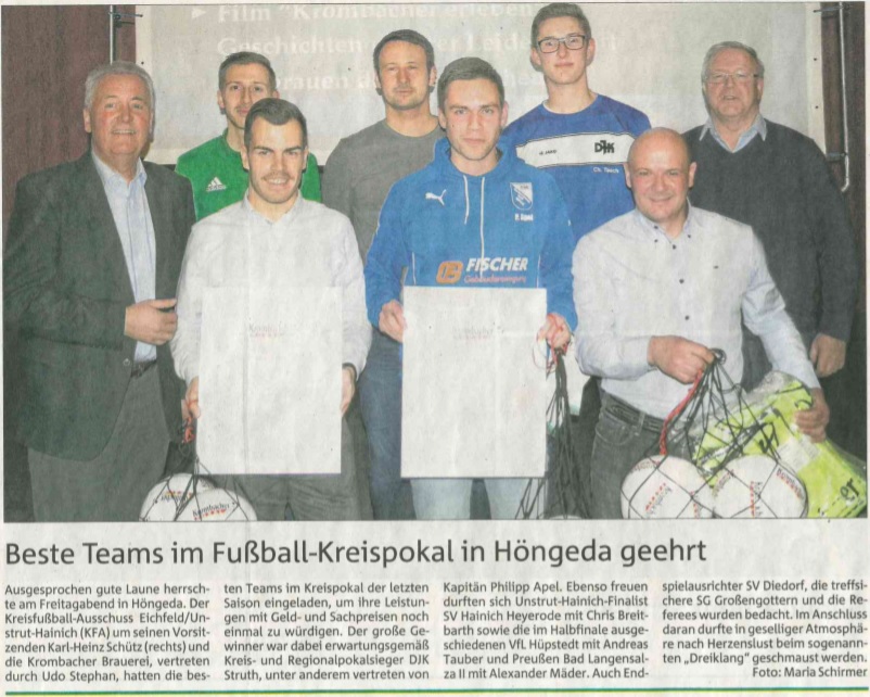 Am Freitagabend wurde das Training dann ausnahmsweise mal in die Schenke nach Höngeda verlagert, wo bei Speis und (viel) Trank die erfolgreichsten vier Mannschaften des Kreispokals der vergangenen Saison geehrt wurden. Leider war unser Team ja im Halbfinale gescheitert, es genoss den Abend beim „Dreiklang“ jedoch ausgiebig und in vollen Zügen, was für das Mannschaftsgefüge natürlich sehr förderlich ist. Nebenbei gab es noch eine kleine Prämie und eine Spende für die Mannschaftskasse vom Sponsor der Veranstaltung, welche Alexander Mäder als verdienter Spieler der zweiten Mannschaft entgegennahm.