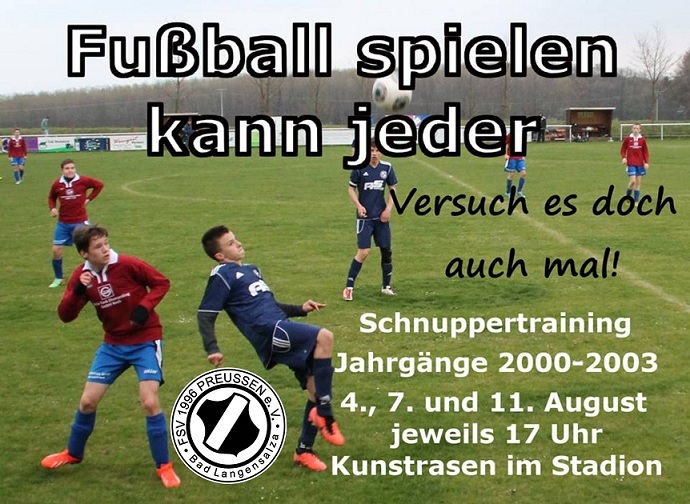 Du hast Spaß am Fußball und willst gern öfter spielen? Du hast es drauf am Ball und willst es allen zeigen? Du hast erst angefangen und willst dich verbessern? Dann suchen wir genau DICH! Denn ab dem 4. August finden auf dem neuen Kunstrasenplatz im Stadion der Freundschaft drei Schnupperkurse (4.8., 7.8. und 11.8.) für die Jahrgänge 2000-2003 statt. Unter Anleitung der Trainer Jörg Weißenborn und Sven Harnisch kannst du dich am Ball und im Team versuchen.