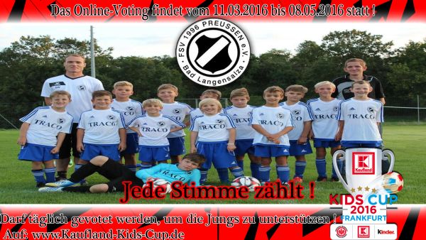 Auch die E2-Jugend unseres FSV Preußen hat sich um die Teilnahme beworben. Um am Kaufland KIDS CUP 2016 teilnehmen zu können, braucht das Team von Steffen Waiz und Heiko Liersch jetzt die Unterstützung und Stimmen aller Preußen! Diese können auf der Seite www.kaufland-kids-cup.de für unsere Junioren stimmen.