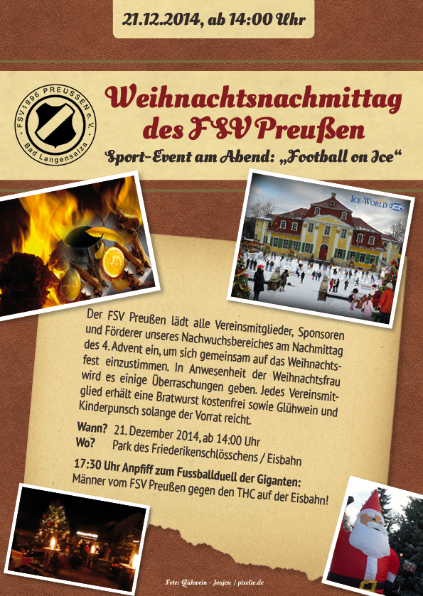 Der Vorstand unseres Vereins möchte nunmehr schon traditionell alle Mitglieder am Nachmittag des 4. Advent einladen, um sich gemeinsam in Weihnachtsstimmung zu bringen. Am 21.12. ab 14 Uhr wird es an der Glühweinhütte an der Eisbahn im Park des Friederikenschlösschen der Villa Italia Glühwein, Kinderpunsch und für jeden Preußen eine Bratwurst auf Vereinskosten geben, das sollte sich keiner entgehen lassen. Wir freuen uns, gemeinsam in großer Runde einige Stunden zu verbringen. Schwarz-Weiße Weihnacht am 21.12.!